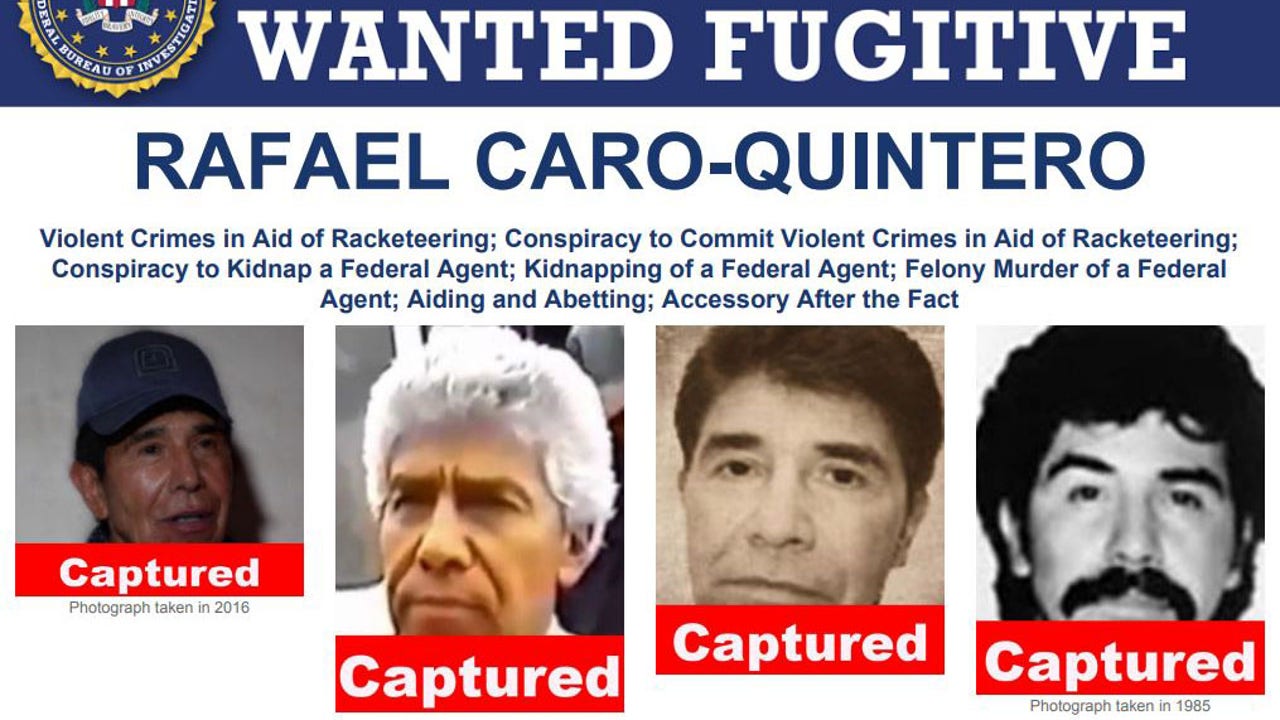 Caro Quintero had walked free in 2013 after 28 years in prison when a court overturned his 40-year sentence for the 1985 kidnapping and killing of U.S. Drug Enforcement Administration agent Enrique "Kiki" Camarena. The brutal murder marked a low point in U.S.-Mexico relations.