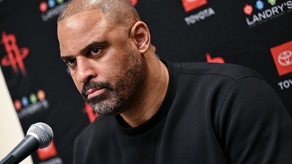 ATLANTA, GEORGIA - JANUARY 29: Head coach Ime Udoka of the Houston Rockets attends a press conference after the game against the Atlanta Hawks at State Farm Arena on January 29, 2026 in Atlanta, Georgia. NOTE TO USER: User expressly acknowledges and