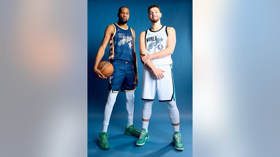 LOS ANGELES, CA - FEBRUARY 14: Kevin Durant #7 of Team USA Stripes and Alperen Sengun #28 of Team World pose for a portrait during the NBA All-Star Game Portraits as part of NBA All-Star Weekend on Saturday, February 14, 2026 in Los Angeles, Californ