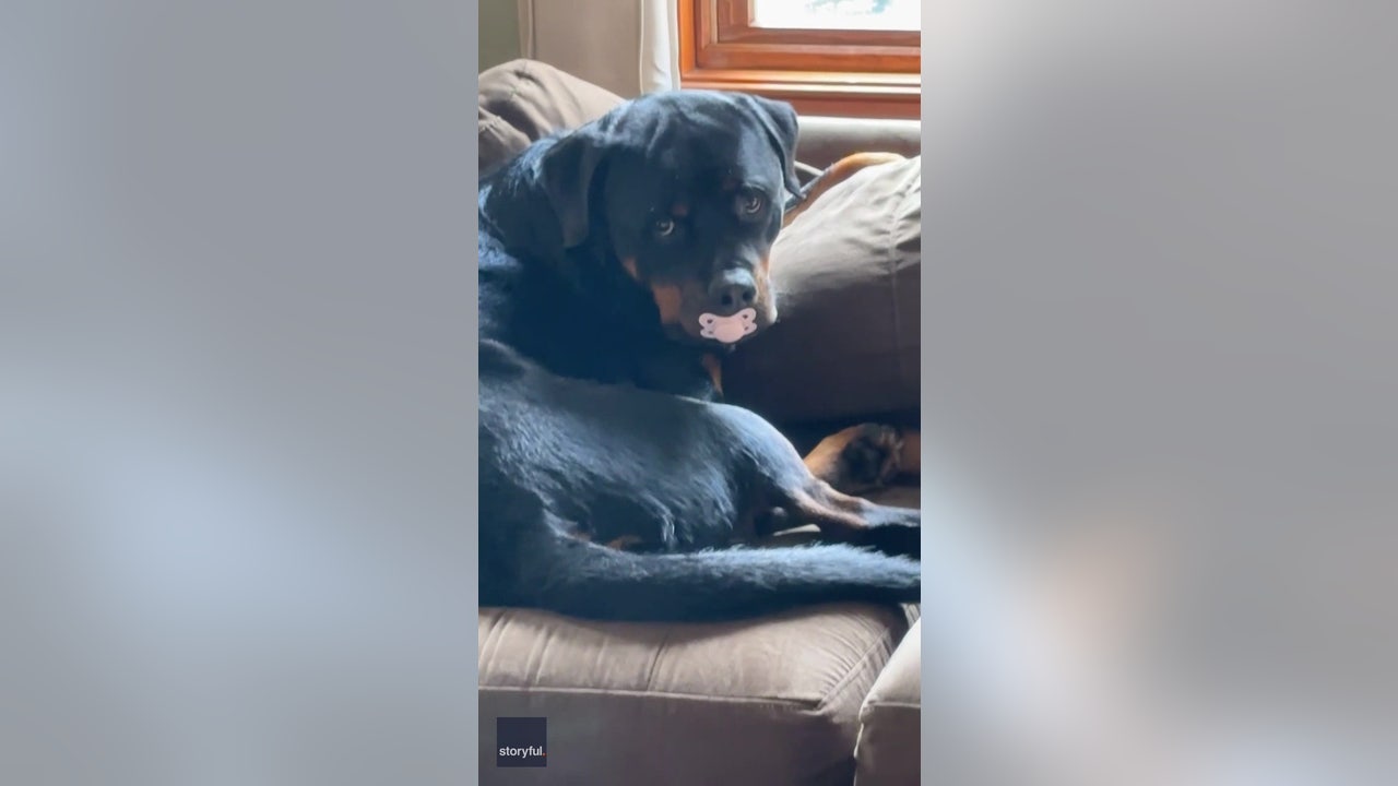 A brawny rottweiler looked decidedly less than tough when his owner caught him chewing on a pink pacifier he took from a newborn baby at the family home in Connecticut.
