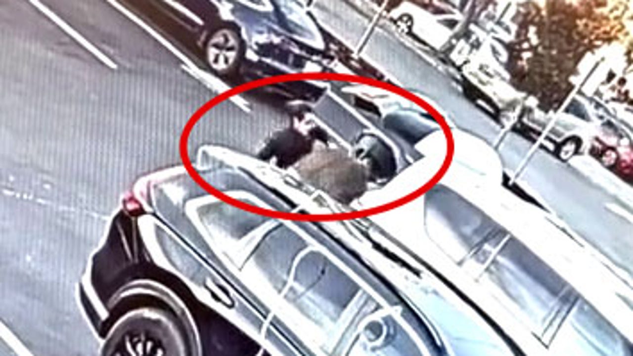 Caught on camera, a daring thief in a white SUV swipes a tree from the top of a parked car.