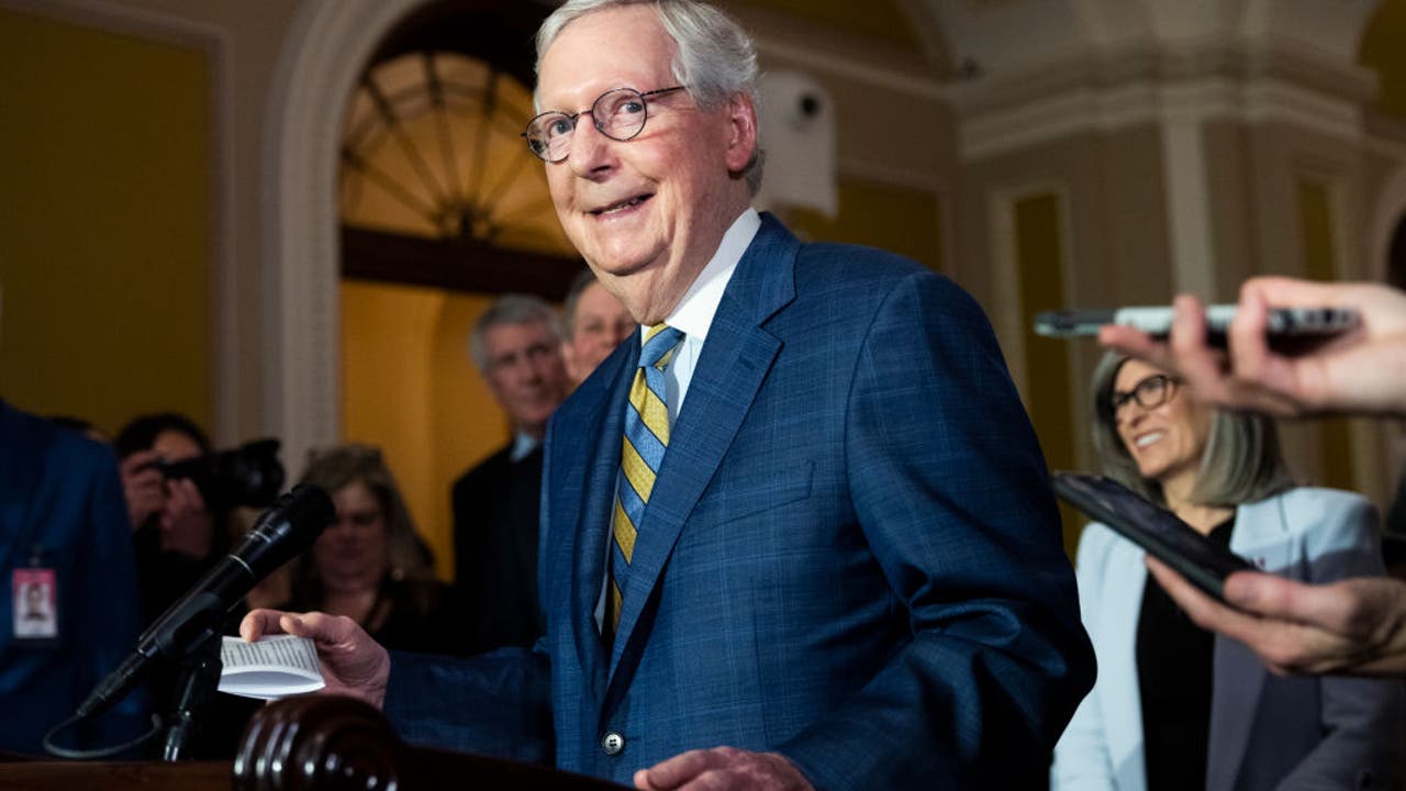 UNITED STATES - MARCH 7: Senate Minority Leader Mitch McConnell, R-Ky., conducts a news conference after the senate luncheons in the U.S. Capitol Building on Tuesday, March 7, 2023.(Tom Williams/CQ-Roll Call, Inc via Getty Images)