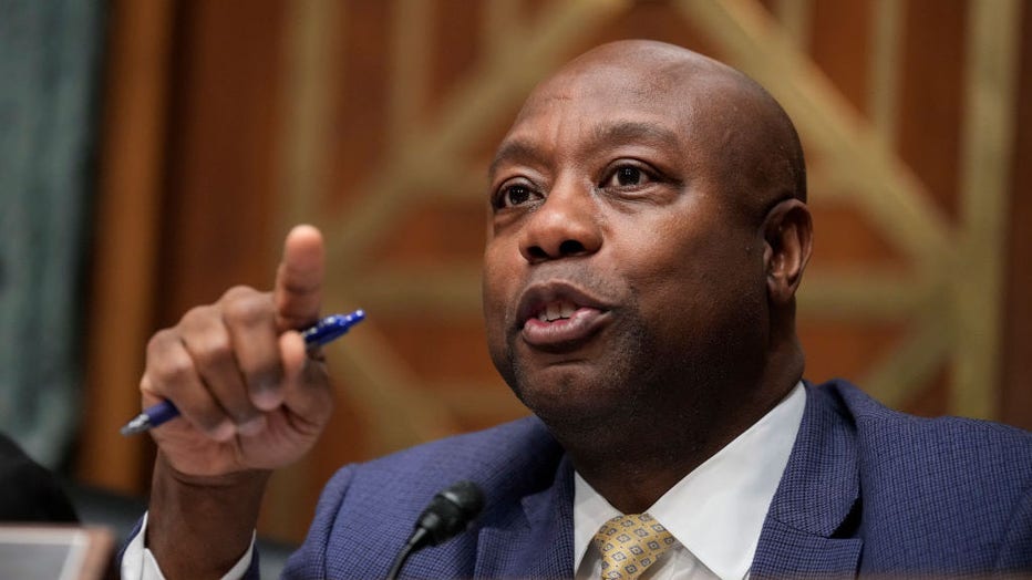 Committee ranking member Sen. Tim Scott (R-SC) speaks during a Senate Banking Committee hearing on oversight of credit reporting agencies, on Capitol Hill April 27, 2023 in Washington, DC. (Photo by Drew Angerer/Getty Images)