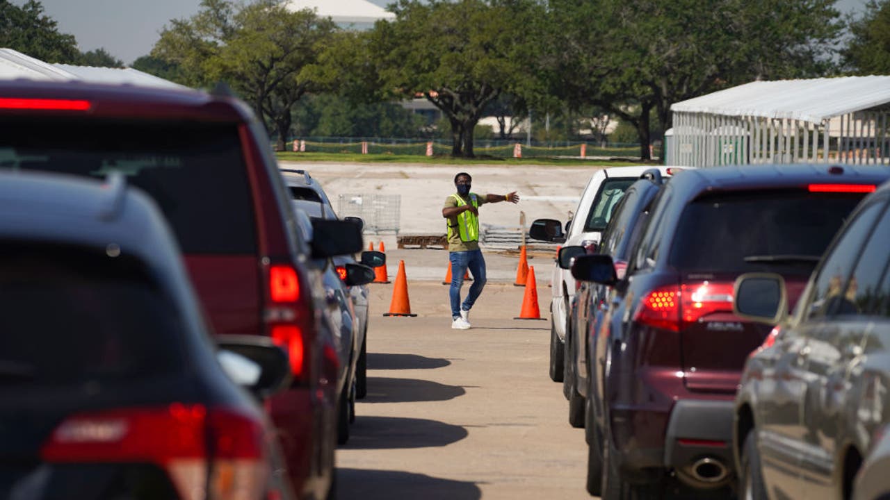 HOUSTON, TX - OCTOBER 07: An election worker guides voters in cars at a drive-through mail ballot drop-off site at NRG Stadium on October 7, 2020 in Houston, Texas. Gov. Gregg Abbott issued an executive order limiting each county to one mail ballot d