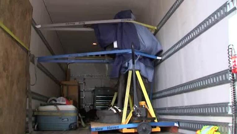 The statue of Christopher Columbus that stood in Bell Park is seen in the back of a truck as it is moved into storage on June 19, 2020.