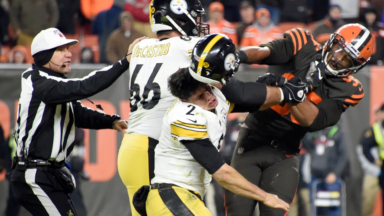 CLEVELAND, OHIO - NOVEMBER 14: Defensive end Myles Garrett #95 of the Cleveland Browns hits Quarterback Mason Rudolph #2 of the Pittsburgh Steelers over the head with his helmet during the second half in the game at FirstEnergy Stadium on November 14 (Photo by Jason Miller/Getty Images / Getty Images)