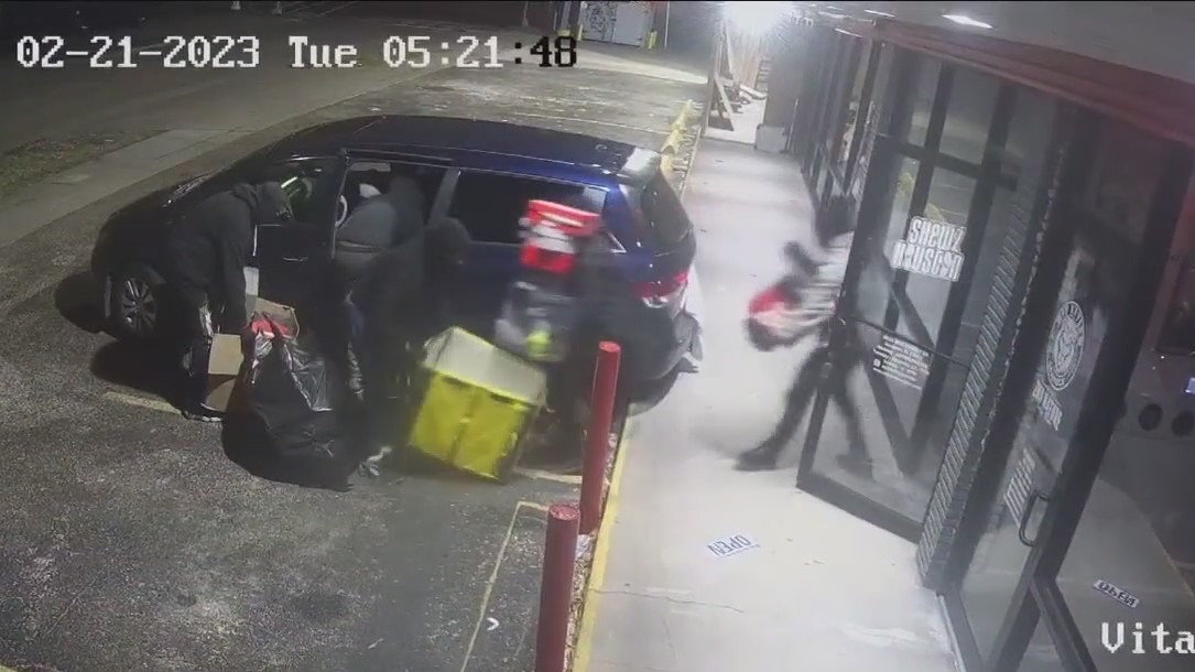 Surveillance video shows multiple thieves early Tuesday morning dragging several large boxes of shoes from a backroom of the store to a car outside. The thieves were stealing from the new business, located near Weistheimer and South Voss Road, for about four minutes.