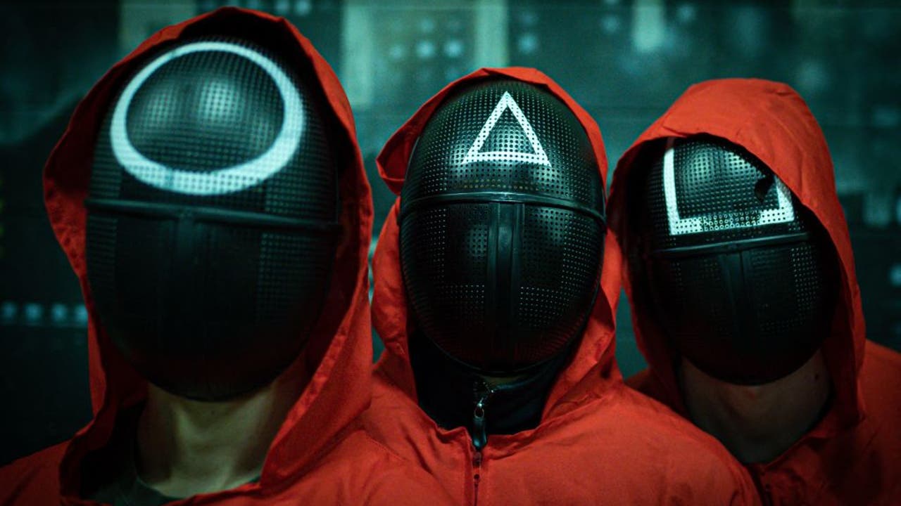 FILE - Masked actors pose during an event organized by the Enigma Room escape game in Milan on Nov. 14, 2021, where participants play some of the games of the world-famous South Korean TV survival drama television series "Squid Game." (Photo by PIERO