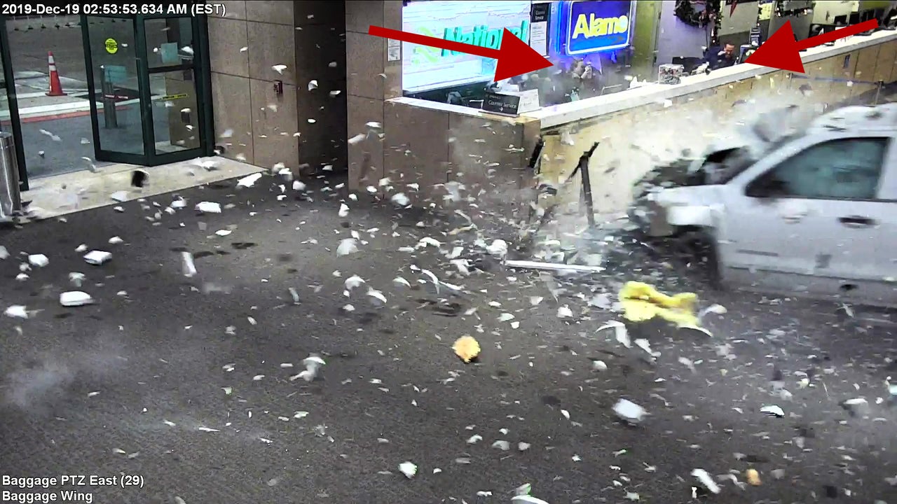 Piccolo said the truck damaged one of the baggage belts before hitting the counter shared by Alamo Rent-A-Car and National Car Rental. Surveillance video shared by the airport showed an employee working at the counter as the careening truck came crashing in, stopping just feet away.