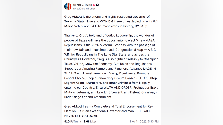 "Greg Abbott has my Complete and Total Endorsement for Re-Election," Trump's announcement says in part. "He is an exceptional Governor and man — HE WILL NEVER LET YOU DOWN!"