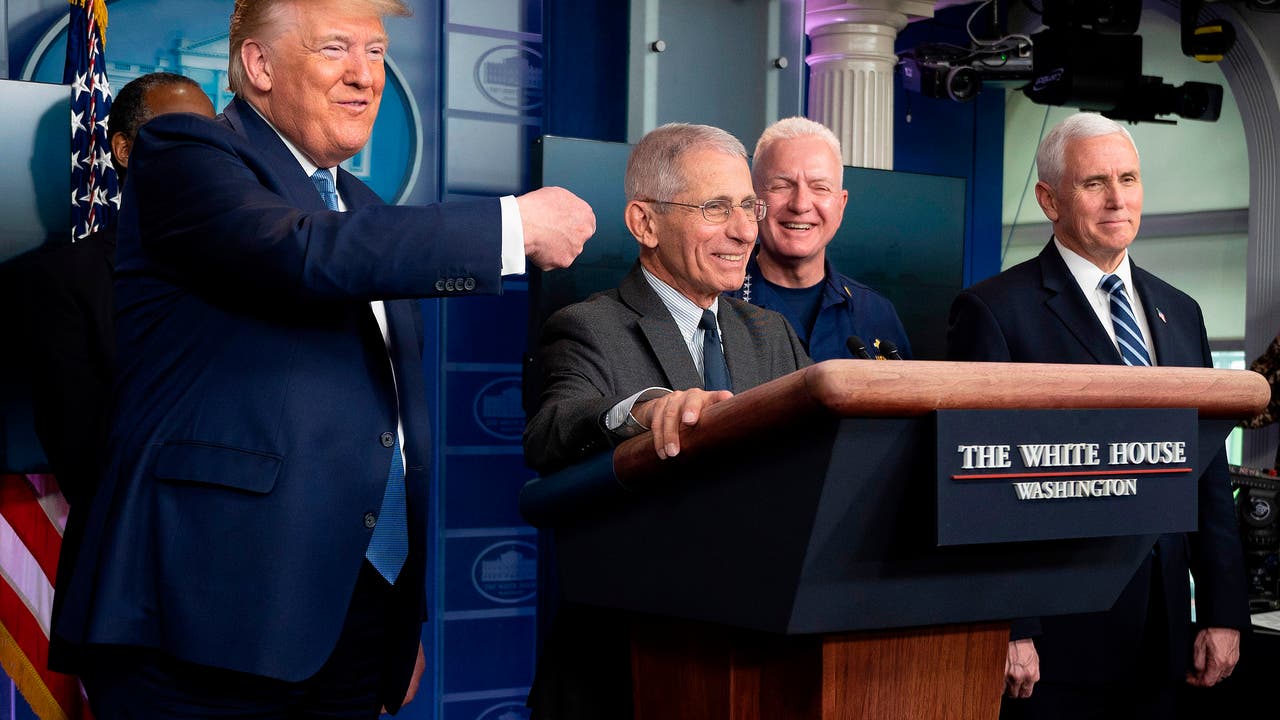 FILE -US President Donald Trump (L) gestures as National Institute of Allergy and Infectious Diseases Director, Dr. Anthony Fauci, speaks during the daily briefing on the novel coronavirus, COVID-19, at the White House on March 21, 2020, in Washingto (Photo by JIM WATSON/AFP via Getty Images)