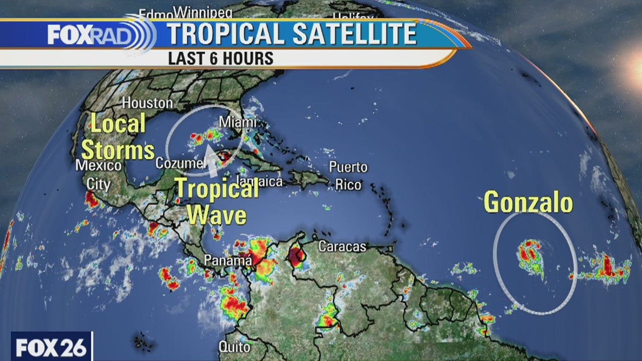 Tropical Storm Gonzalo formed in the Atlantic on Tuesday, and a tropical wave in the Gulf has a 50% risk of becoming a depression.