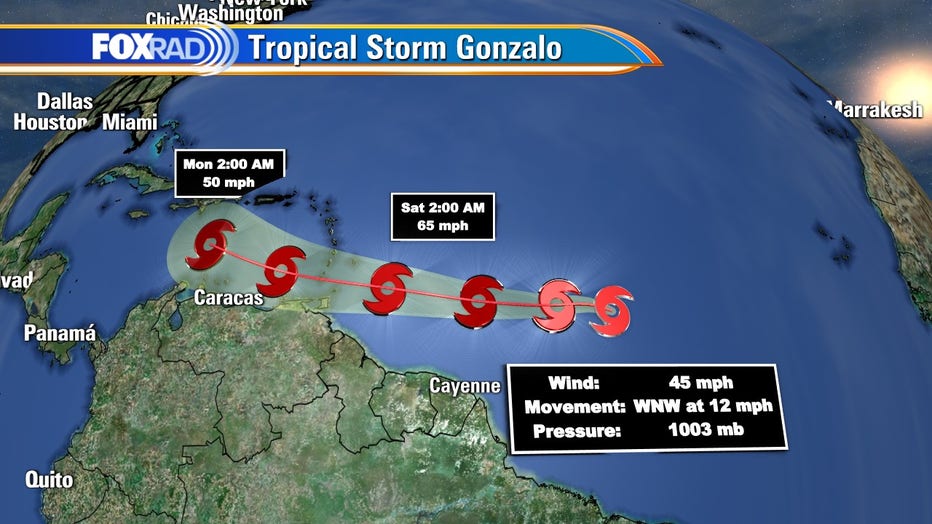 Tropical Storm Gonzalo is far from Texas and is just a concern for the Caribbean for now.