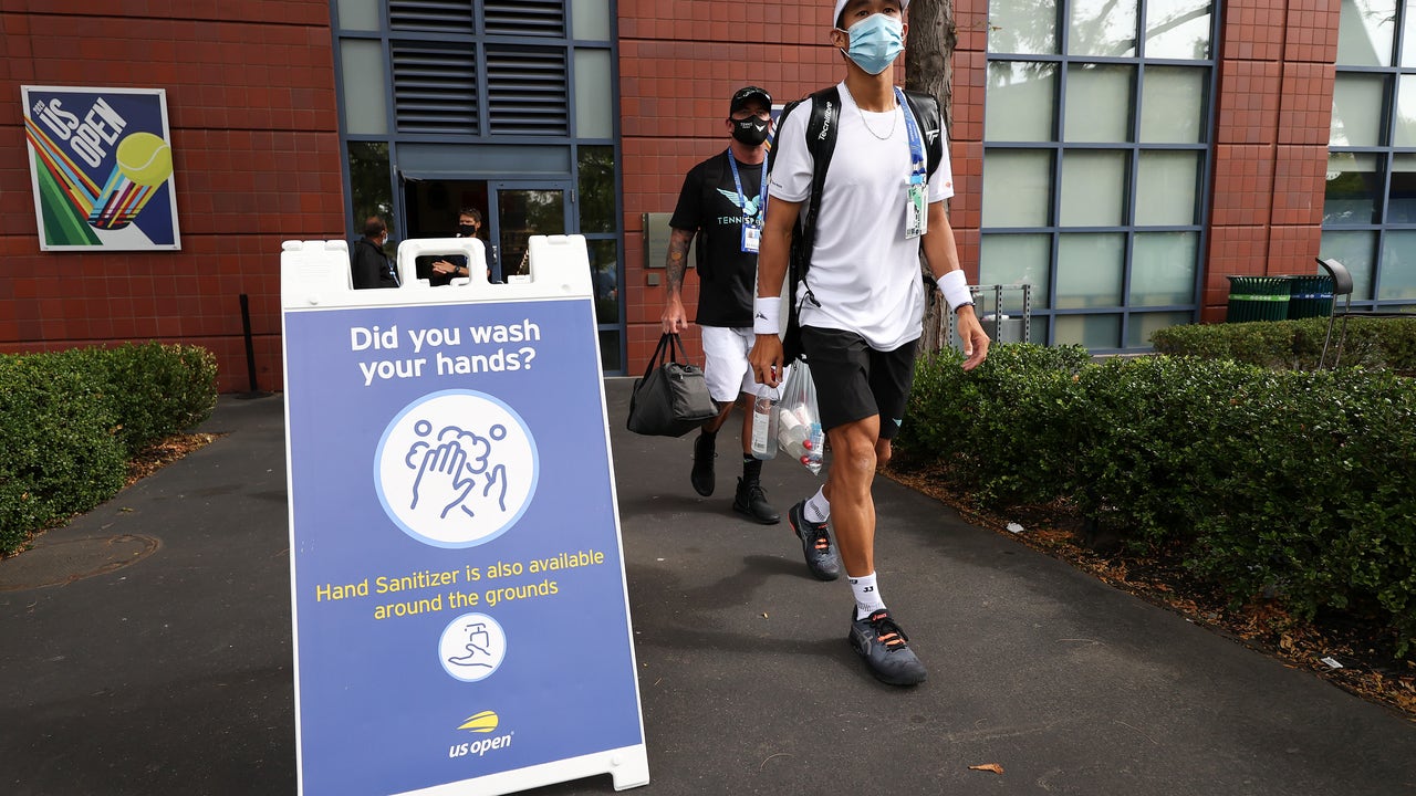 A tennis player wears a face covering as he walks the grounds on Day One of the 2020 US Open.