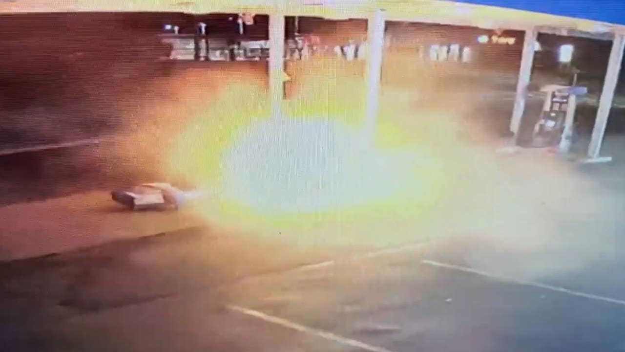 Security footage, which officials say was captured in the early morning hours on Sunday, shows the car hitting into the gas pump, causing an explosion and fire. The driver is then seen fleeing the station.