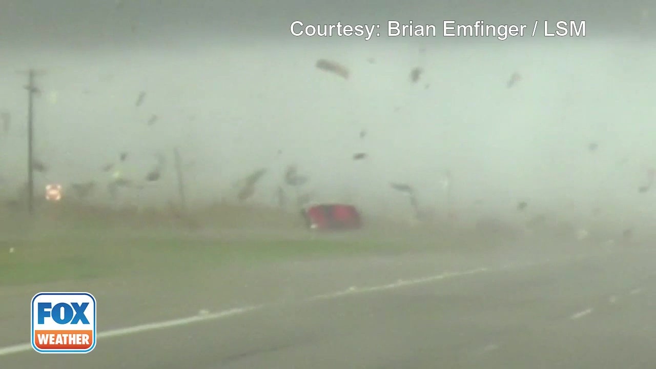 The video above, shot by storm chaser Brian Emfinger of Live Storms Media, shows a red truck driving down a road in Elgin, Texas, as it gets blown over onto its side by a tornado. The truck was then spun around before getting flipped back upright onto its wheels.