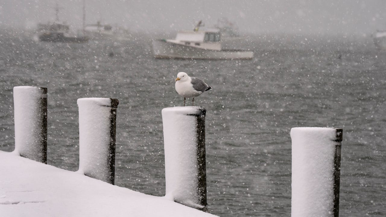 File image of a seagull perching on a piling at the Cape Porpoise pier on Tuesday, March 14, 2023. (Staff photo by Gregory Rec/Portland Press Herald via Getty Images)