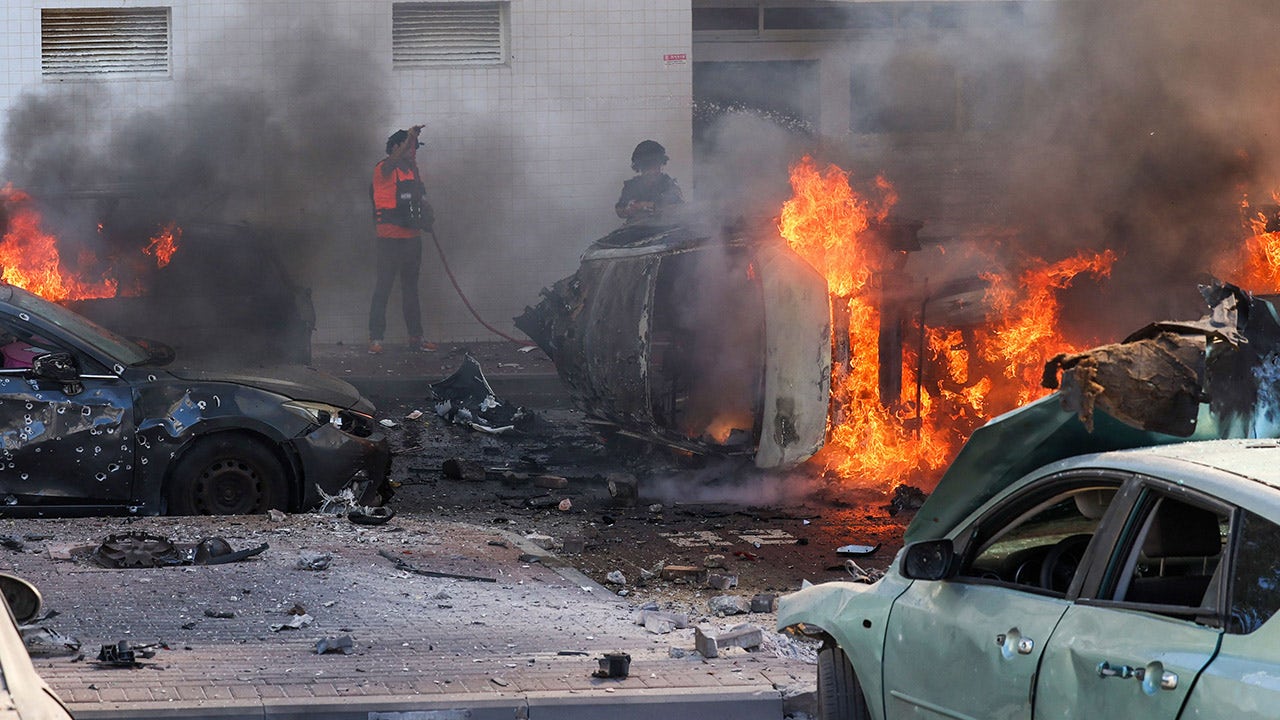 People try to extinguish fire on cars following a rocket attack from the Gaza Strip in Ashkelon, southern Israel, on October 7, 2023. (Credit: AHMAD GHARABLI/AFP via Getty Images)