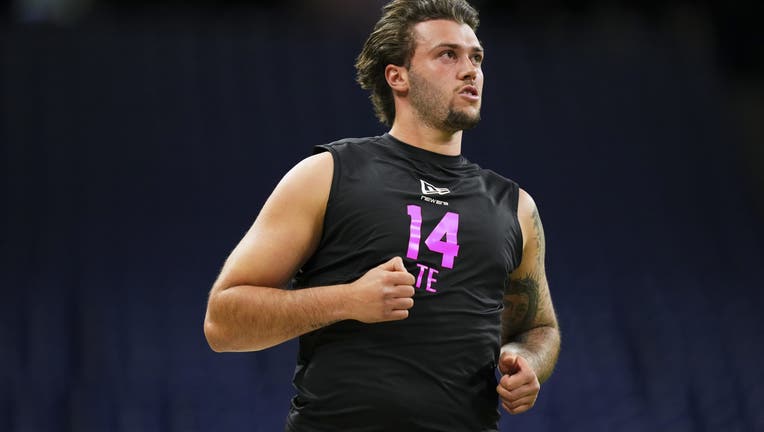INDIANAPOLIS, IN - FEBRUARY 27: Marlin Klein #TE14 of Michigan runs the 40-yard dash during the 2026 NFL Scouting Combine at Lucas Oil Stadium on February 27, 2026 in Indianapolis, Indiana. (Photo by Cooper Neill/Getty Images)