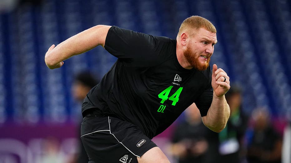INDIANAPOLIS, IN - MARCH 01: Keylan Rutledge #OL44 of Georgia Tech participates in a drill during the 2026 NFL Scouting Combine at Lucas Oil Stadium on March 1, 2026 in Indianapolis, Indiana. (Photo by Cooper Neill/Getty Images)