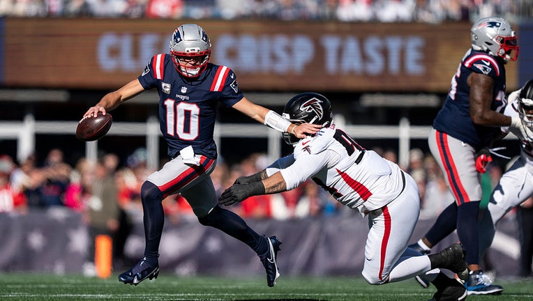 FILE-Drake Maye #10 of the New England Patriots stiff arms LaCale London #94 of the Atlanta Falcons as he runs with the ball and looks to pass during an NFL football game at Gillette Stadium on November 02, 2025 in Foxborough, Massachusetts. (Photo b