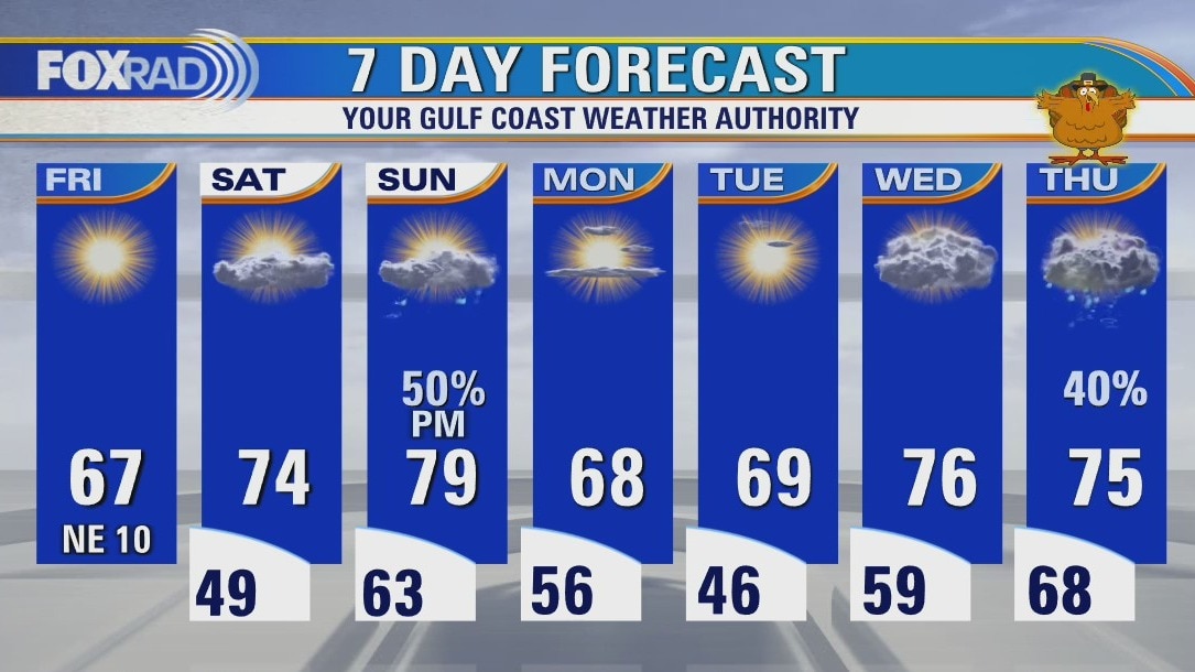 Lows this morning reached the 40s in most spots and that cool, dry air will remain in place today. Look for sunshine, very low humidity and highs in the 60s. The weekend looks fine, but showers are likely by late in the day on Sunday. Models are also showing stormy weather beginning late next week, so it could affect Thanksgiving and/or Black Friday shopping.