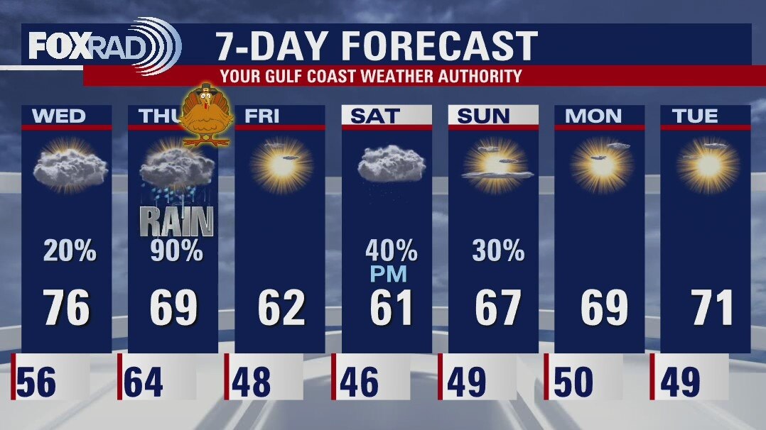 Wednesday will be a little warmer and there will be more clouds. Rain becomes likely on Thursday and some thundershowers are likely as a front pushes into the Gulf. Friday is clear with cool temps and rain will be back by later on Saturday.