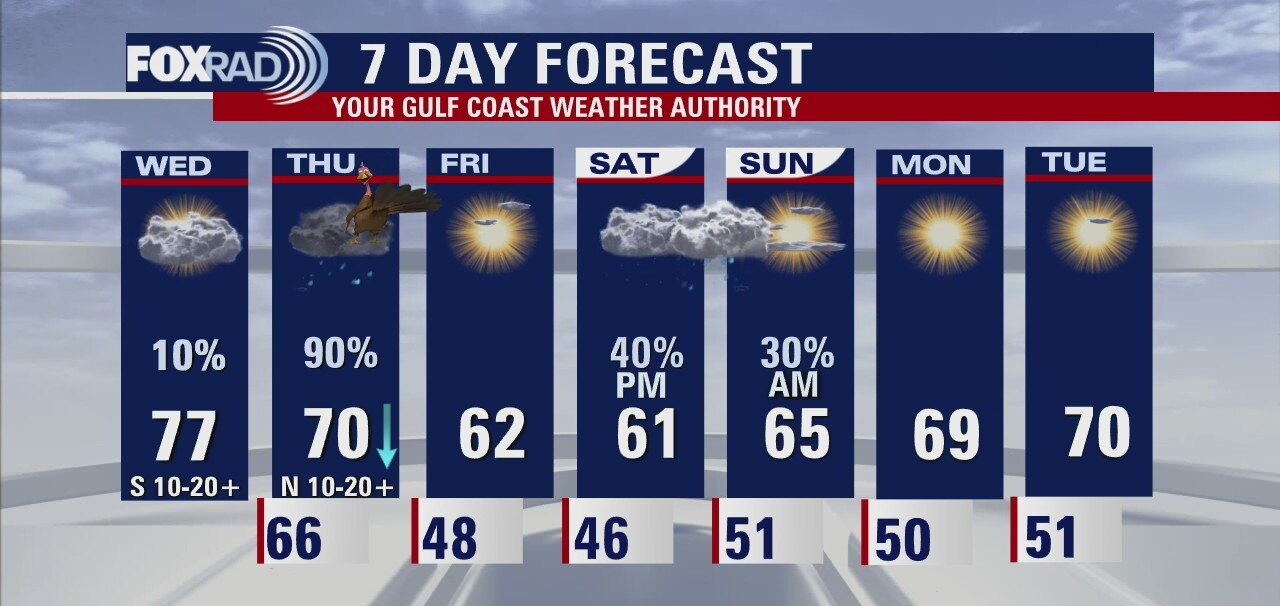 Get ready for a roller coaster weather ride over the next few days. Expect a windy Wednesday followed by a stormy Thanksgiving and a sunny, chilly Friday. Some rain could be heavy for Thursday with up to 4" possible in isolated spots. Morning parades are looking iffy at best. Storms should clear out in time for the Uptown Park holiday lighting.