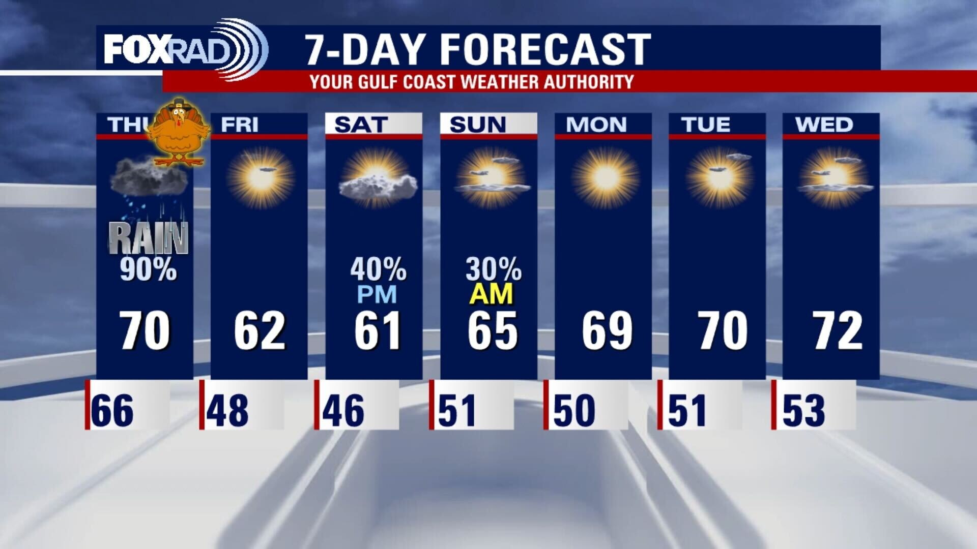 Rain is likely for the morning and early afternoon on Thanksgiving as a cold front moves across the area. Most places can expect 1-2 inches of rainfall and some isolated areas getting more. Friday looks chilly and clear with highs in the 60s