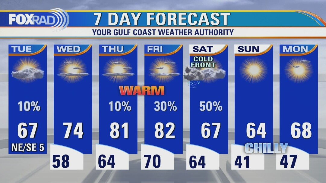 We'll feel a brief cooldown today, but nothing out of the ordinary. Look for highs in the mid 60s with a few peeks of sun along with spotty sprinkles. Fog will be possible tonight with lows in the 50s. A warming trend kicks back in tomorrow with highs in the low to mid 70s, then into the low 80s Thursday and Friday. A stronger cold front is scheduled for early Saturday.