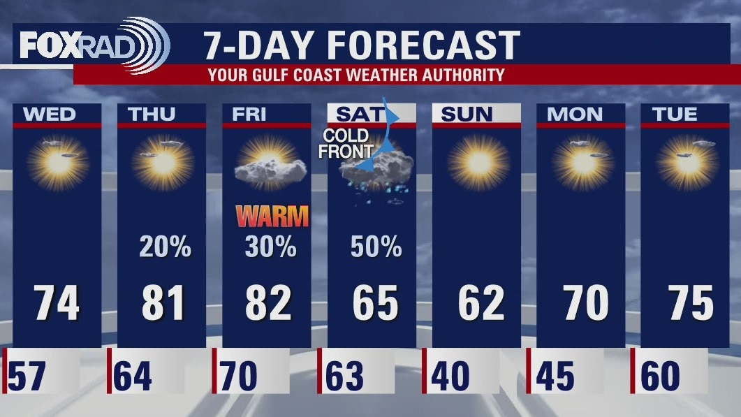 Another cool night for Southeast Texas with lows in the 50s but the warmer weather starts returning Wednesday. Houston could see record high temperatures at the end of the week before the next cold front arrives Saturday morning. Rain chances will stay low until the front brings a line of showers/storms. A perfect end to the weekend with more cool weather to start the workweek.