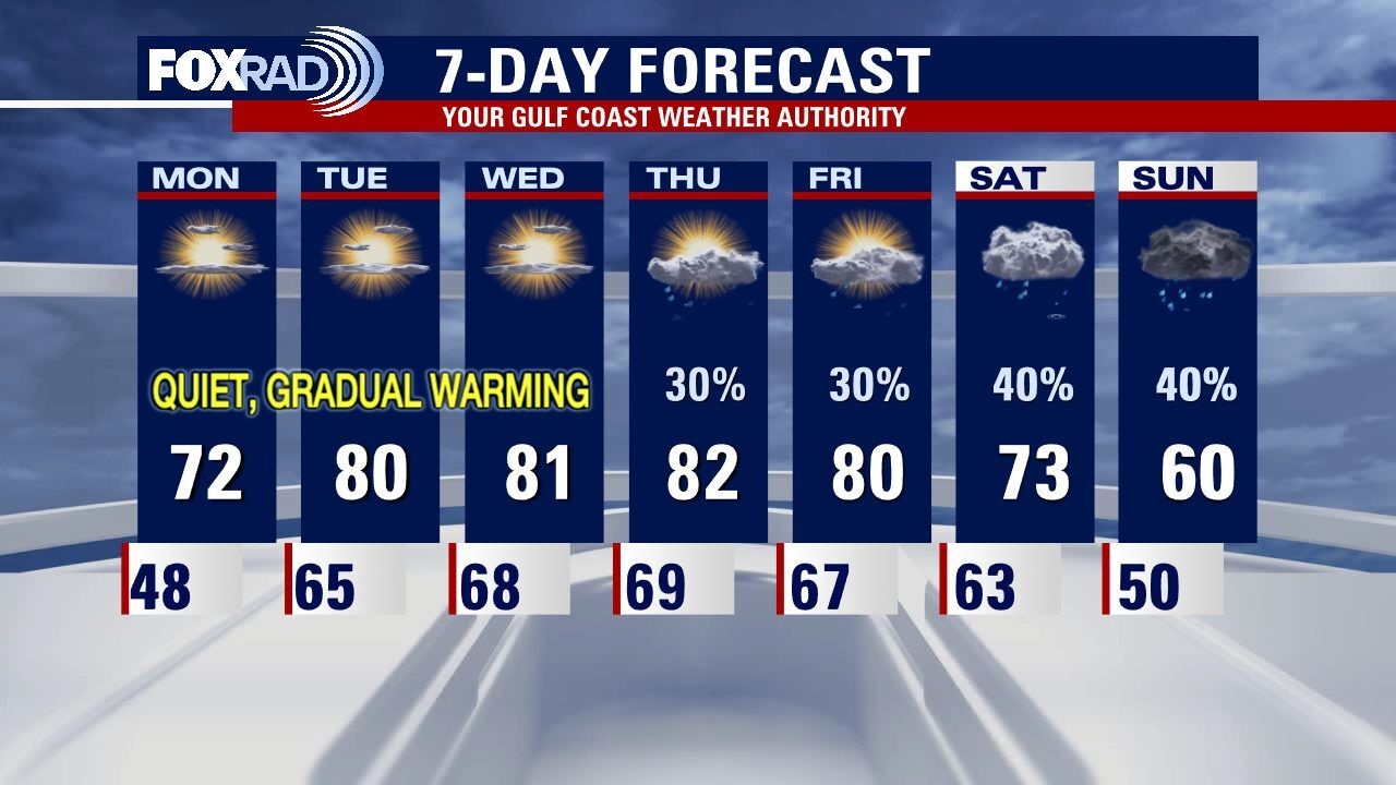 One more cool morning set for Monday and then warm temperatures start returning to Southeast Texas. A front should approach Houston towards the end of the week and stall before reaching the coast. That should give enough moisture for some rain but not anything too stormy is expected at this point.