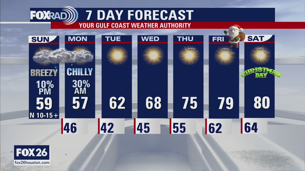 Saturday's cold front brought a chill to the air, but it will only last a couple of days. A coastal low will bring some light, spotty showers to the area overnight Sunday into the start of the day on Monday, but accumulation will be light if anything. A warm, dry stretch starts on Tuesday. Santa will be delivering gifts to southeast Texas in shorts!