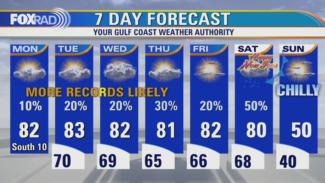 Our pattern of record warmth will stay in place this week with daily high temperatures in the low 80s and overnight lows in the upper 60s. We will finish this month as the warmest December on record by far. Watch for New Year's Day rain followed by a brief, but intense blast of cold air.