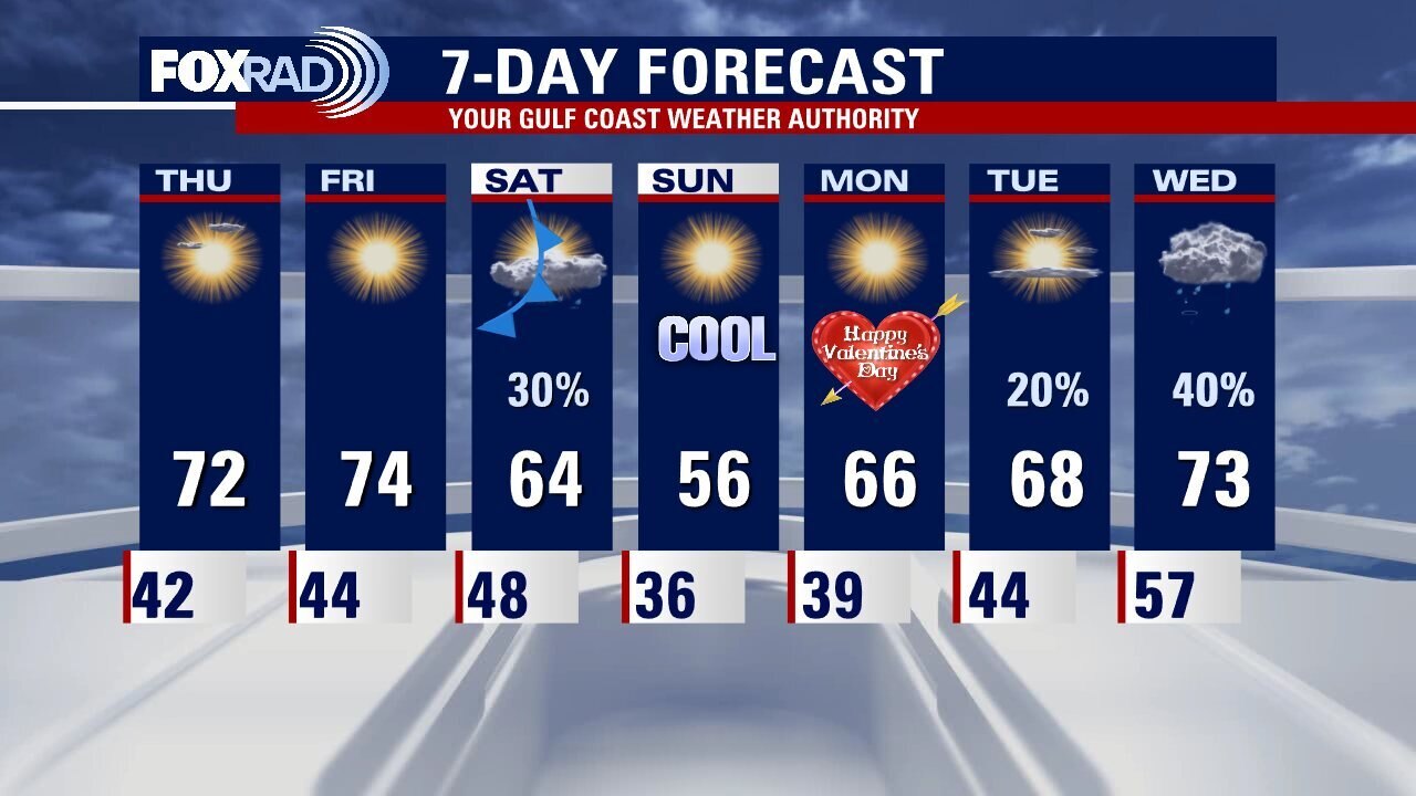 The quiet and pleasant weather continues for the rest of the week. A cold front on Saturday will bring isolated showers to southeast Texas and a chilly end to the weekend. Valentine's Day is looking great for Houston if you want to plan something outdoors for that special someone in your life.