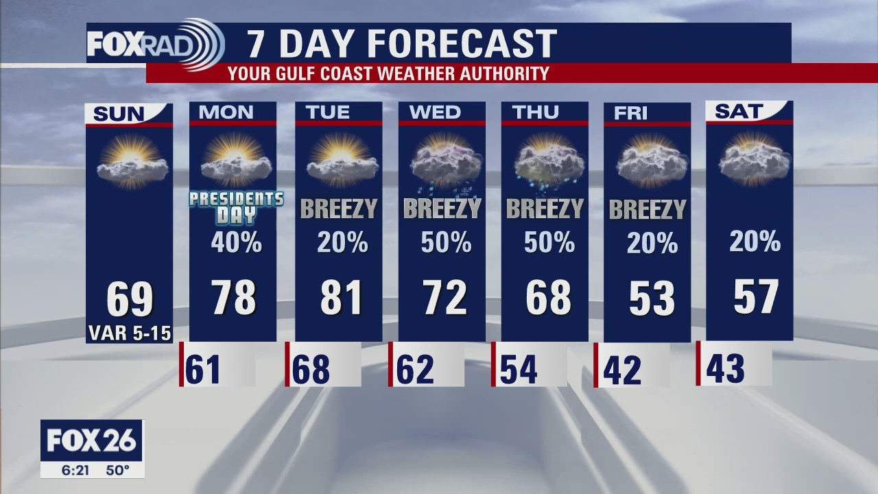 The weekend ends on a mostly dry, though mostly cloudy note with some PM drizzle or mist possible. Then temperatures and humidity will be on the rise. Look out for patchy fog in the mornings at the start of the week, as a warm front lifts north off the Gulf launching our temperatures to near 80. Daily chances for isolated showers and storms linger throughout the week due to a midweek cold front that stalls, though accumulations look to be light and severe weather is not expected at this time. It will be breezy all week long, and sunshine will be hard to come by.