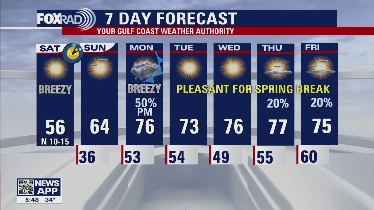The weekend will be chilly, but sunny and dry. Temperatures quickly climb back into the 70s by Monday when our next front looks to arrive. Notice, though it is a cold front our temperatures stay in the 70s throughout Spring Break. This air mass comes from the Pacific -- not Canada so, weather locally is looking pleasant overall. Look out for scattered showers and storms mainly Sunday afternoon and evening, and it'll be breezy but out of the south. Otherwise, rain chances are minimal but another front may arrive late week.
