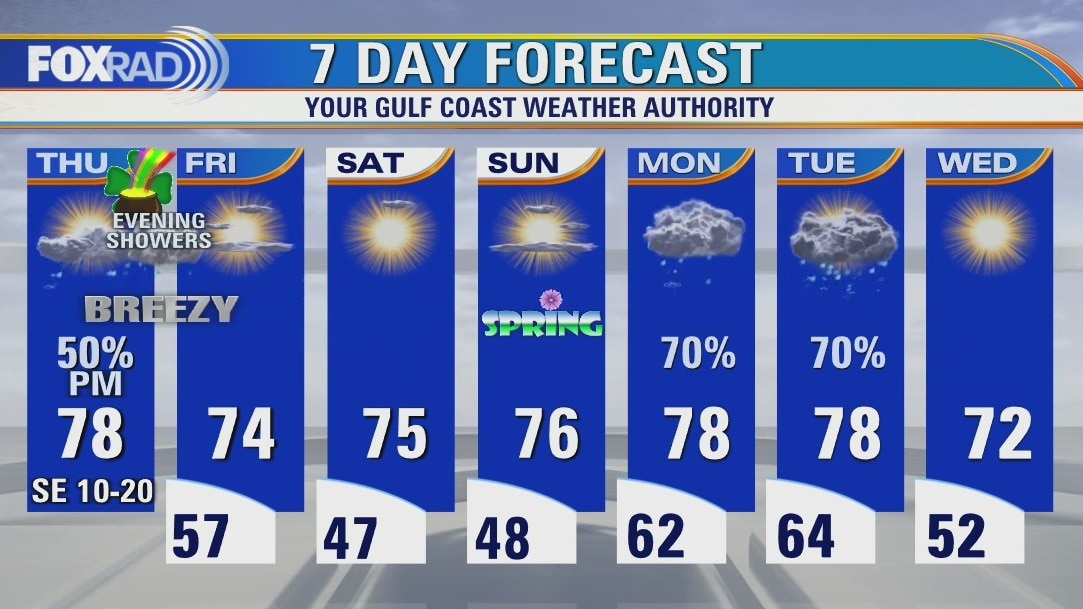 Watch for scattered showers late today along with increasing clouds and breezy southeast winds. A weak front will move through overnight followed by sunny, dry weather Friday through the weekend. We will watch for the potential for rainy weather by Monday and Tuesday.