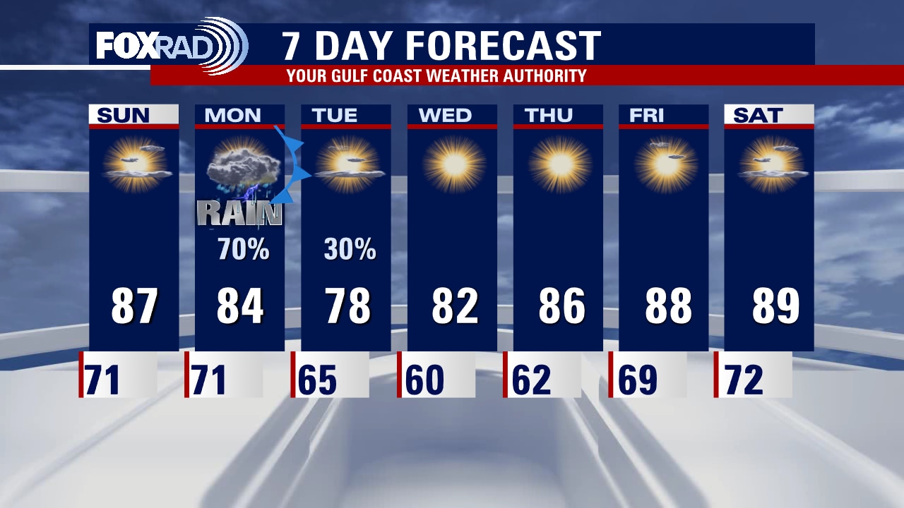 Another windy and warm day is on deck tomorrow. Temperatures will climb into the mid and upper 80s with partial sunshine. Our next cold front is set to slowly push in Monday afternoon - Monday night. Some of the rain could be heavy at times. A few leftover showers are still possible early Tuesday. High pressure builds for the remainder of next week, allowing for bright sunshine and dry weather to prevail.