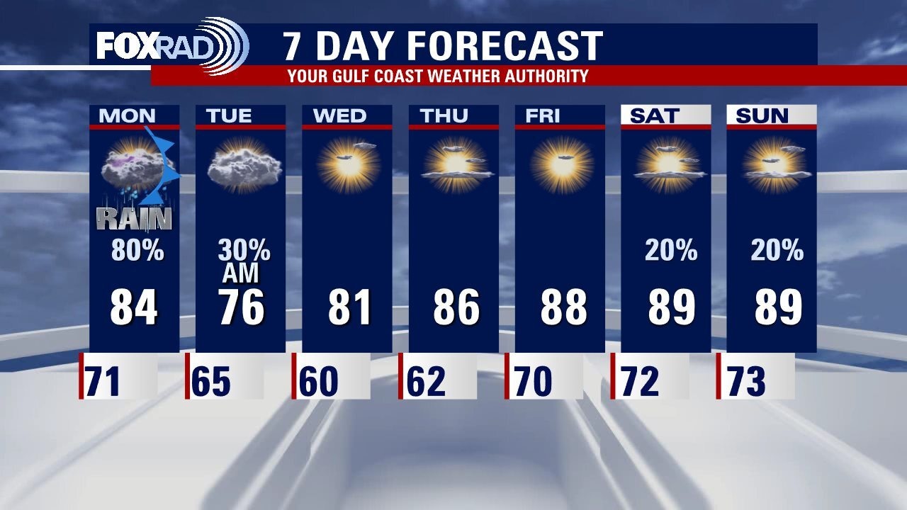 A front moves through southeast Texas Monday afternoon bringing showers and storms. The rain should carry over into the overnight Monday and a few showers extend into Tuesday morning. Skies start to clear on Tuesday afternoon with a pleasant spring day in Houston on Wednesday.