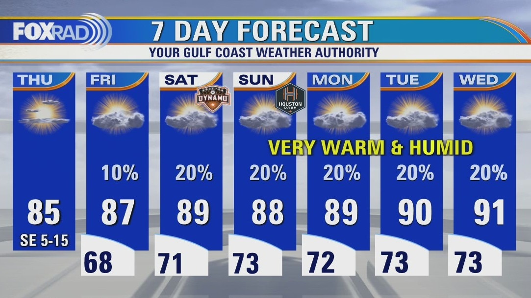 Today is a transition day with the return of gulf breezes marking the start of a warming trend and toward a more humid pattern. Look for highs in the mid 80s today, then a gradual rise to the upper 80s and even low 90s by this weekend and next week. Rain chances remain isolated at around 20% this weekend with south and southeast breezes for the MS150 and lots of other outdoor events this weekend.