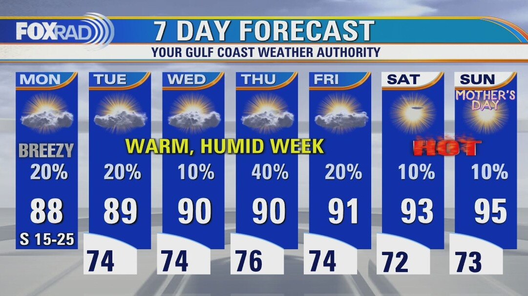 The warmest weather of the year so far is on the way this week. Look for a windy and warm Monday with a slight chance for showers, followed by a very warm and humid pattern through Friday. The best chance for storms will likely arrive late Thursday. Otherwise, the story turns to a hot Mother's Day weekend with a good chance for highs in the 90s and possibly some mid 90s.