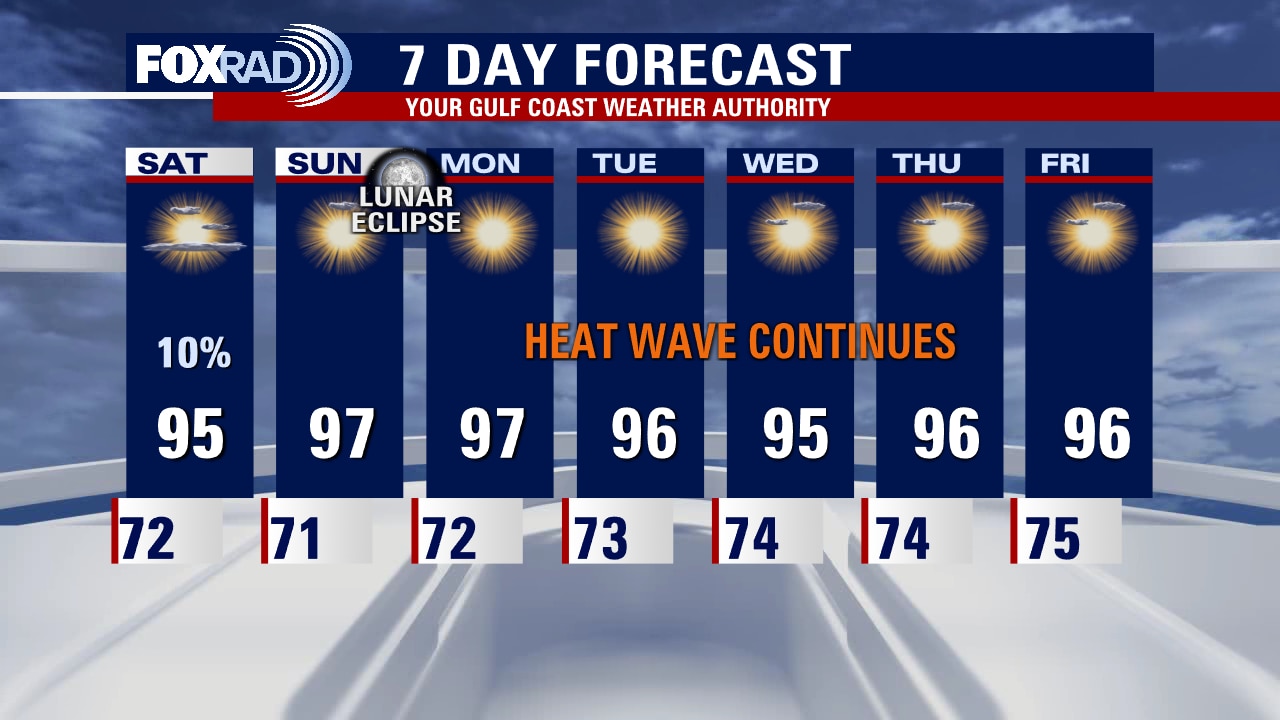 We are heading into the weekend with more heat! An isolated 10% chance for a shower or thunderstorm is possible on Saturday but most locations will remain dry with sunshine. Highs this weekend will soar into the 90s with heat index values climbing into the triple digits by Sunday. Don't forget about the Lunar Eclipse on Sunday night, the skies will be clear providing fantastic viewing conditions!