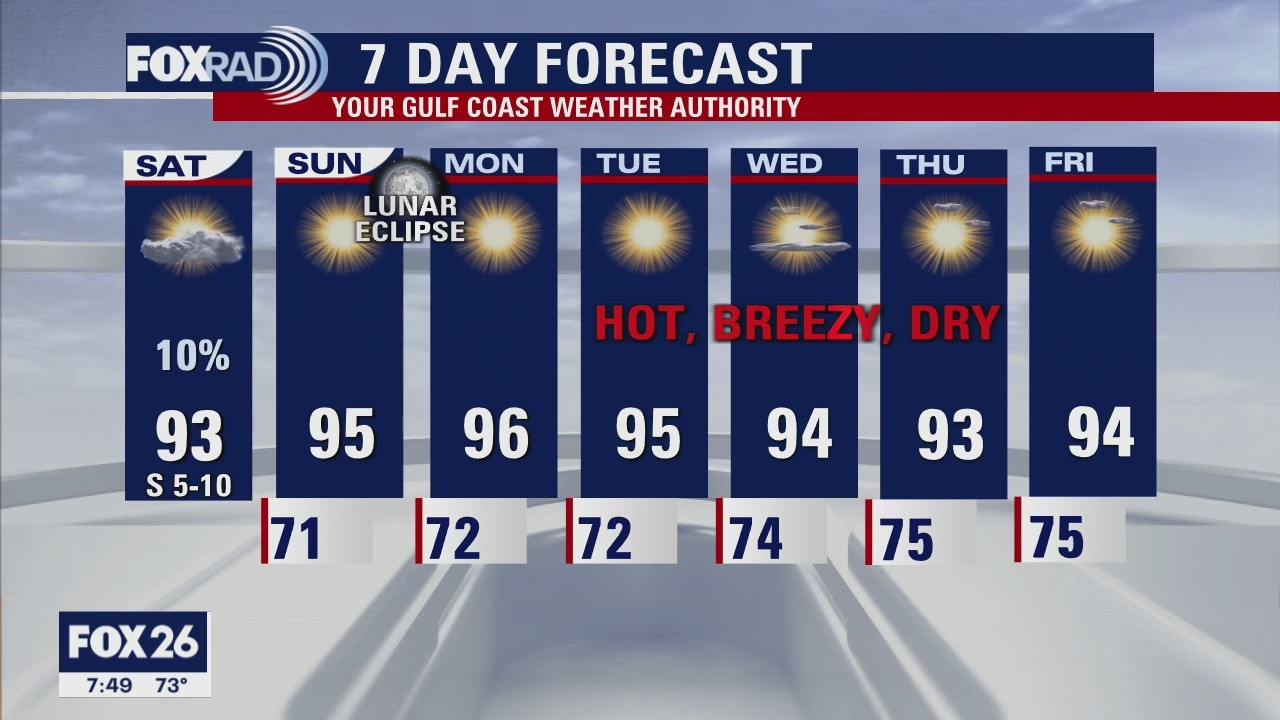 Temperatures are trending slightly cooler, which I'm sure we are all pretty happy about. But it will still be plenty hot out, and well above average over the course of the next week. Rain chances still look slim at best, but we may squeeze out an isolated shower or storm today though most of us remain dry. And after lighter winds this weekend, gusty gulf breezes kick back in next week. Congrats Grads!
