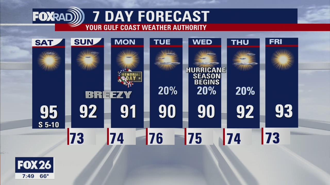Another ozone action day today with bright sunshine and light winds. Today will also likely be the hottest day of the long weekend, with "feels like" values in the upper 90s. Although we don't need to worry about rain, be sure to practice sun/heat safety. Beach/swimming safety will be more of a concern Sunday and Monday, with stronger winds that could create rip currents, and choppy elevated seas. Not much changes in the extended forecast, though we may see some isolated showers middle of next week.