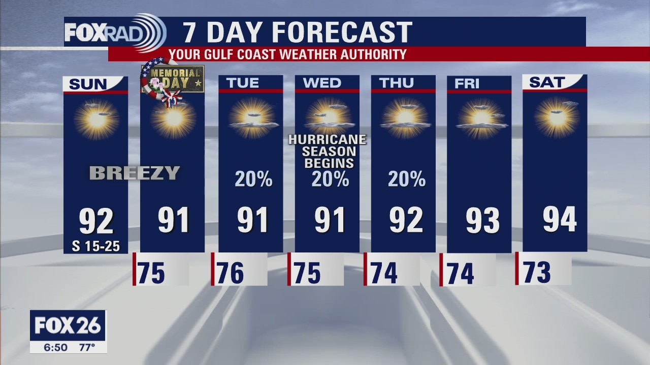 A warm, and breezy end to the long weekend with increasing humidity. Isolated to widely scattered daily showers and storms are possible, but will be very limited in coverage and intensity if they occur. Be sure to keep sun, heat, and swimming safety in mind for any outdoor plans as not much changes over the course of the extended period. Staying warm and sunny through our first weekend in June.