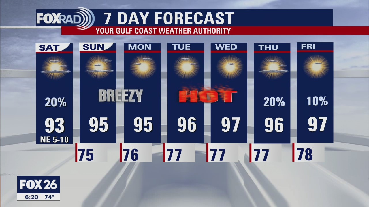 A warm, typical summer like weekend is setting up across southeast Texas as we transition from a bit of an unsettled pattern to a hot and dry one. Hit or miss showers will be in the vicinity today, mainly south of I-10. No need to cancel outdoor plans but you may have to dodge a quick moving shower this afternoon-evening. Tomorrow, we crank up the heat as gulf breezes return and humidity will have things feeling like 100+ for much of next week. Speaking of 100, we may tap our first triple digit day next week in some locations... and even if we don't, we'll certainly come close.
