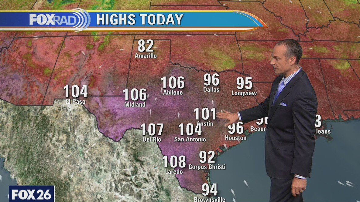 A heat wave is in place and will likely persist for at least a week and possibly longer. High pressure should drive our temperatures from the mid-90s today to the upper 90s and some triple-digits by this weekend. Temperatures in central and southwest Texas could exceed 105 all week long. Rain chances remain slim - not zero, but also not very likely. The tropics remain quiet for now.