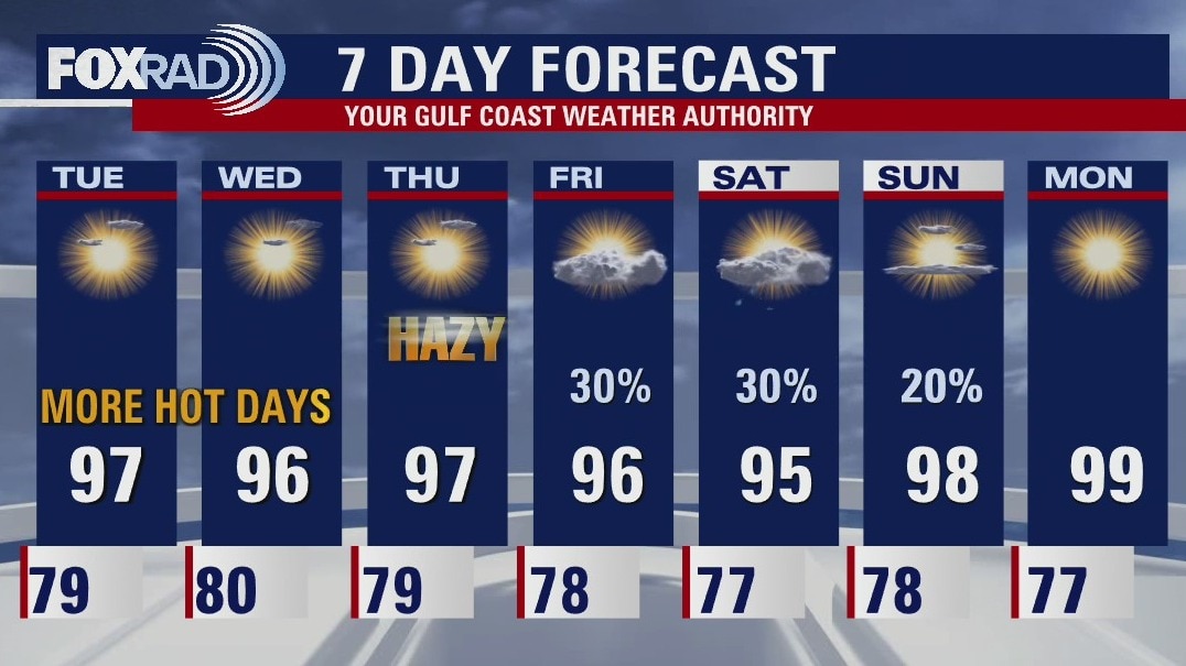 The heat wave continues for southeast Texas. Look for more upper 90s to start the week in Houston and keep practicing all you heat safety precautions. Another thick batch of Saharan Dust will arrive on Thursday worsening air quality and making the skies very hazy. Hopefully there will be a few much needed showers/storms around to start the weekend.