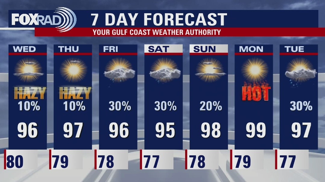 Even more Saharan Dust moves into Southeast Texas Wednesday afternoon keeping hazy conditions in the forecast for Houston. It has been a while since there has been measurable rain across the area, so most will welcome a shower or downpour on Friday or Saturday. More upper 90s return for the end of the weekend and the start of next week.